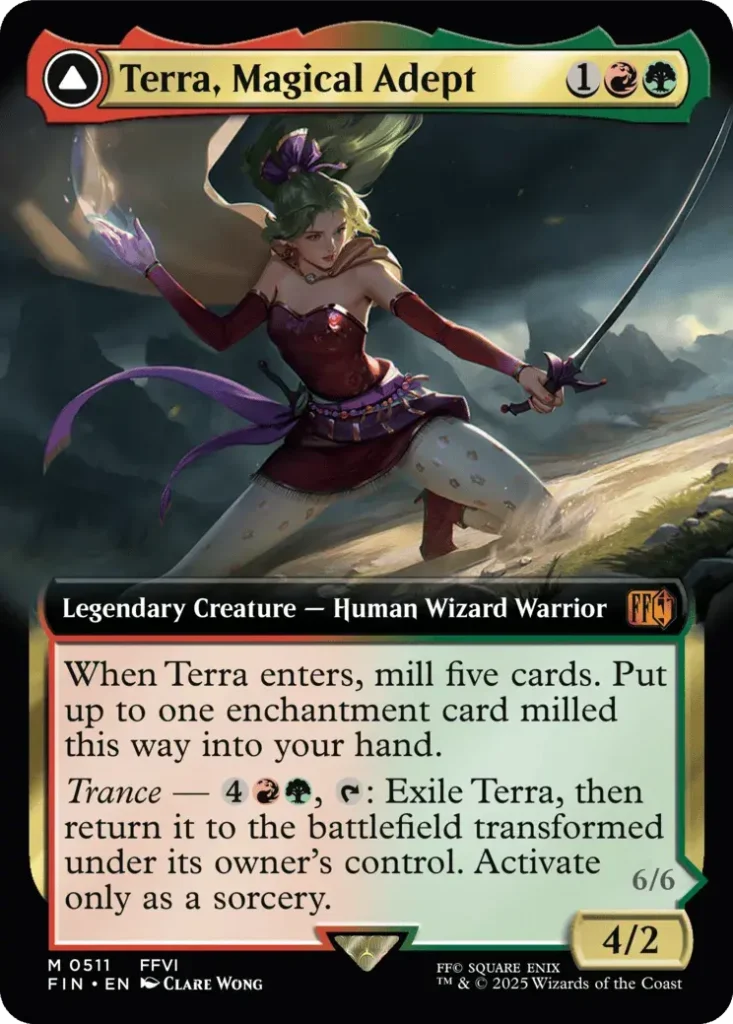 Of course I had to create her as one of my first Party Leaders. I chose the Terra, Magical Adept version because she allowed me to use most of the mechanics that make the Final Fantasy set unique. She leans heavily into Sagas and makes great use of the Town cards due to her transformed side granting her as her color identity.