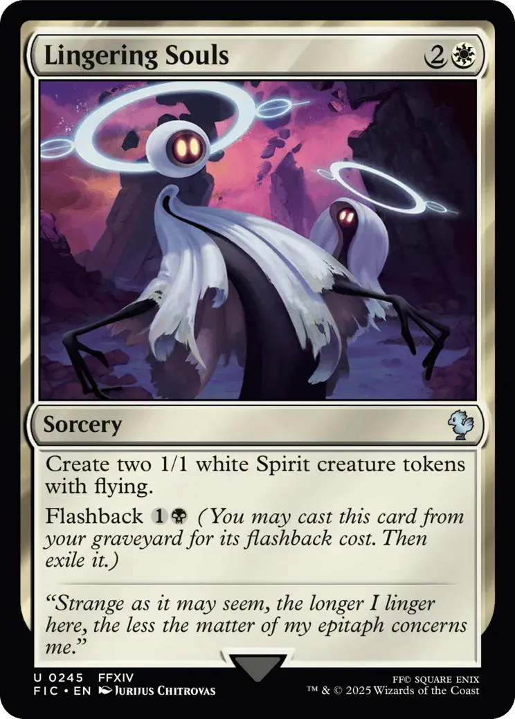 There’s a few good Limit Breaks you can put in the Command Zone, but ultimately I chose Lingering Souls because it’s cheaper than Aerith Rescue Mission and the tokens fly, but you lose access to flashback. Sure, the rescue mission brings out an extra hero, so maybe you’re into that. Another good Limit Break is Cornered by Black Mages but the